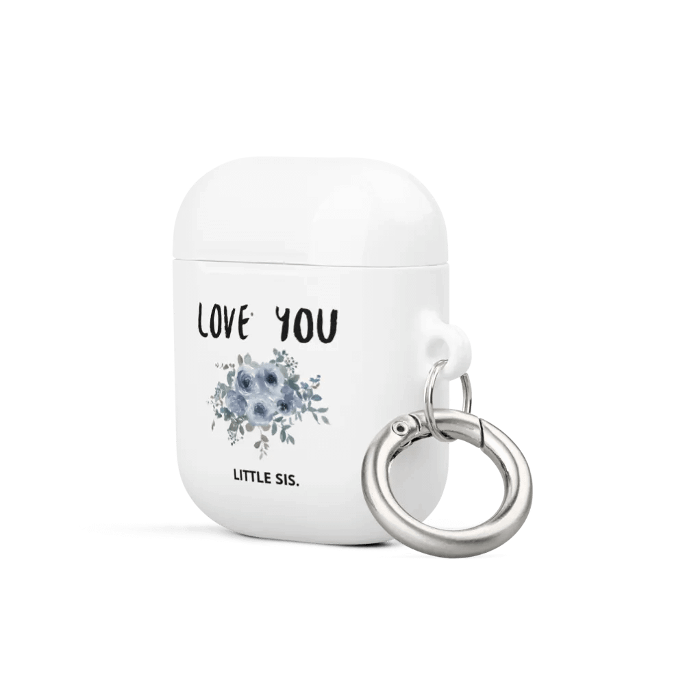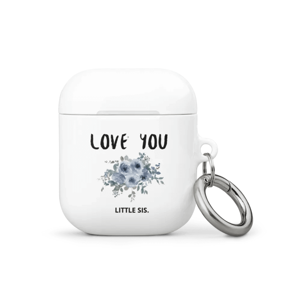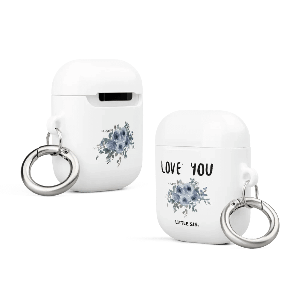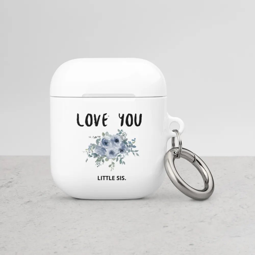 "Love You, Little Sis" blue floral spray bouquet AirPods® Case with impact-absorbing protection and metal carabiner. Compatible with wireless and regular chargers.