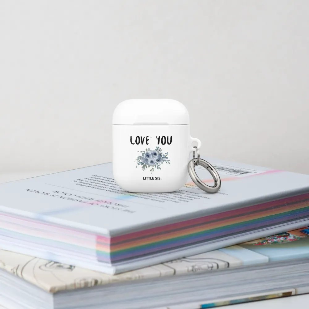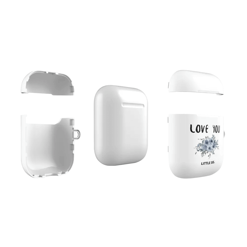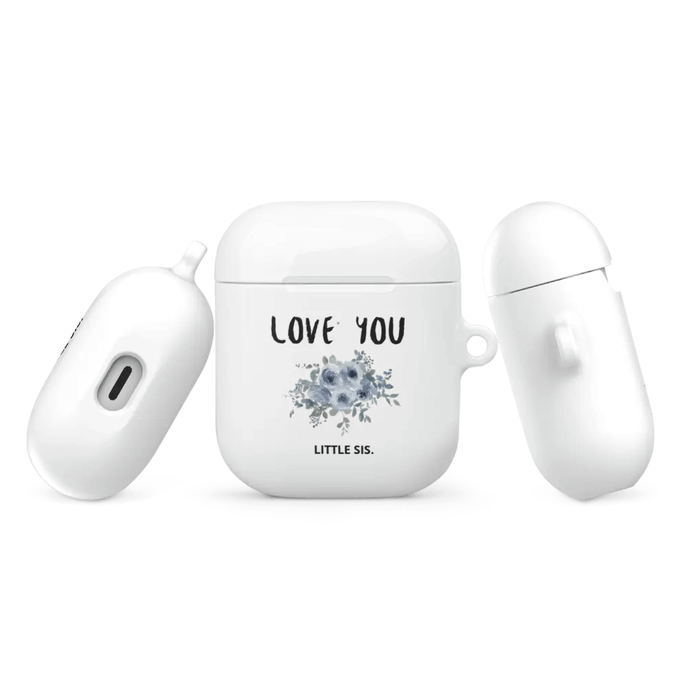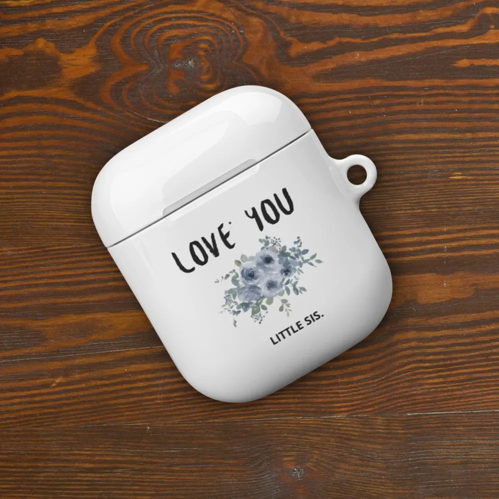 "Love You, Little Sis" blue floral spray bouquet AirPods® Case with impact-absorbing protection and metal carabiner. Compatible with wireless and regular chargers.