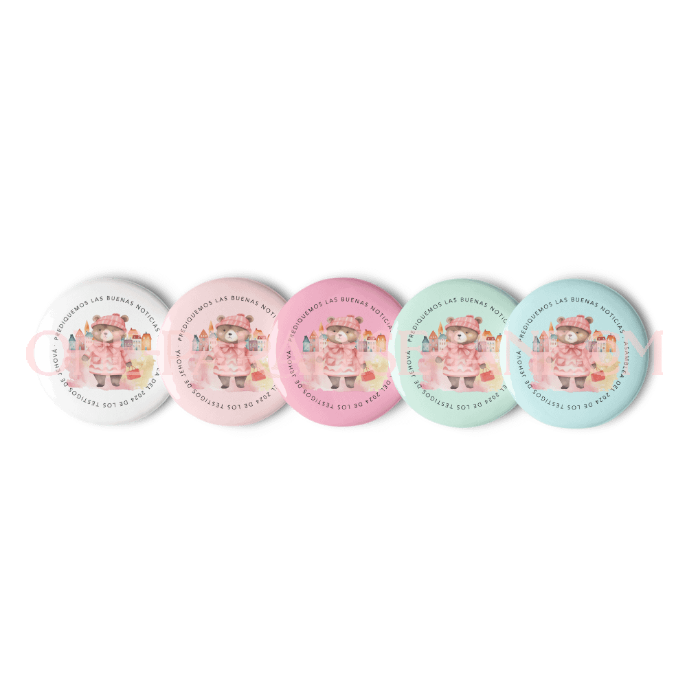 Our darling teddy bear is ready to "declare the good news". Pastel colored pin buttons with Spanish text promoting the 2024 "Declare the Good News" regional convention of Jehovah's Witnesses. Made of tinplate with scratch-resistant mylar coating, these glossy buttons come in 1.25″ and 2.25″ sizes.