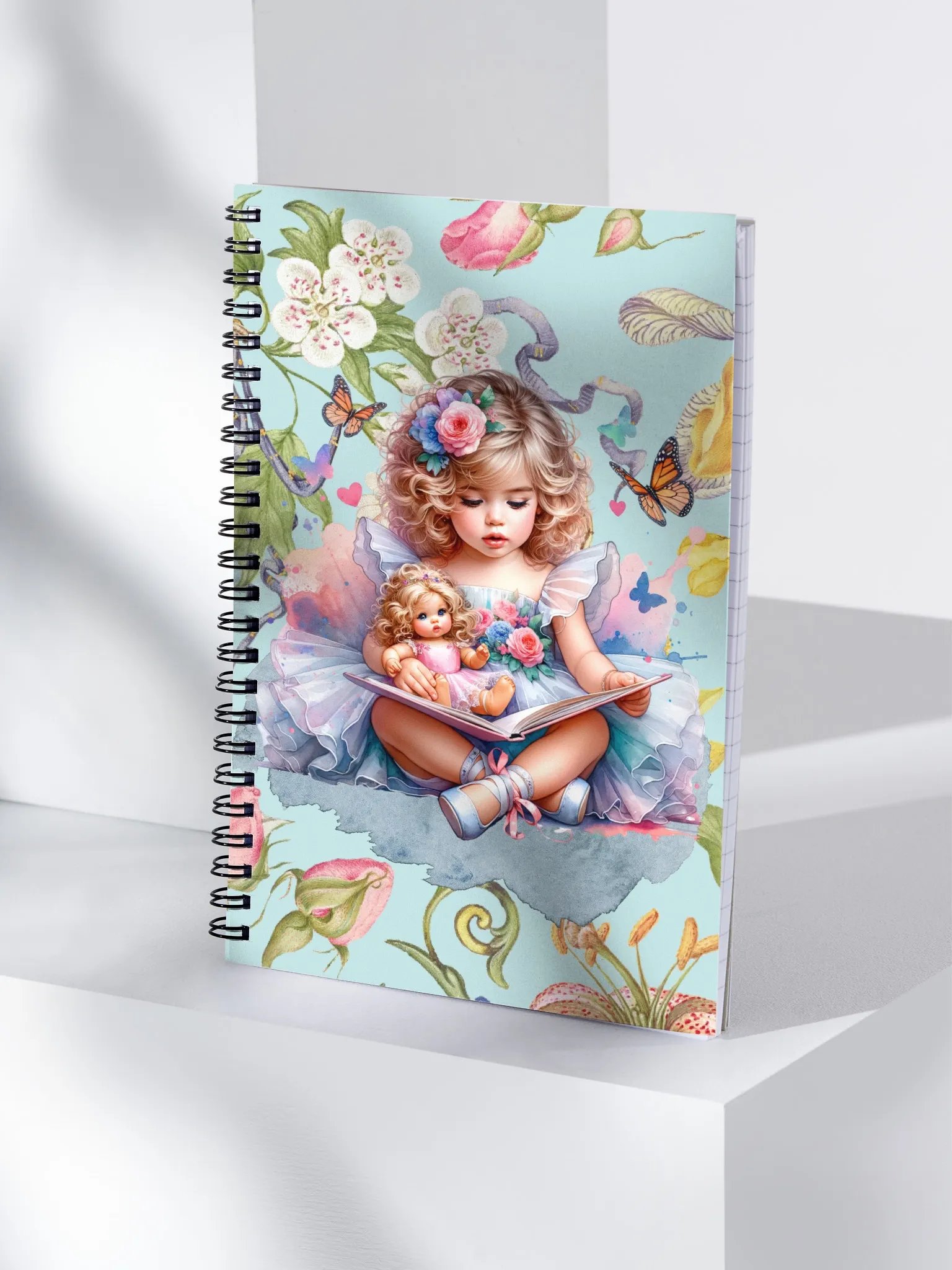 "Pretty Little Darling with Doll Reading" Exotic Blooms on Aqua Spiral Notebook